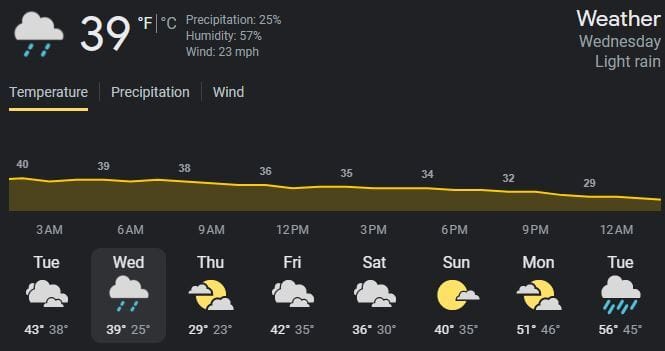 ☁️ Mentor Weather - Cloudy, windy; Possibly spotty showers in the afternoon - Temp 39-45