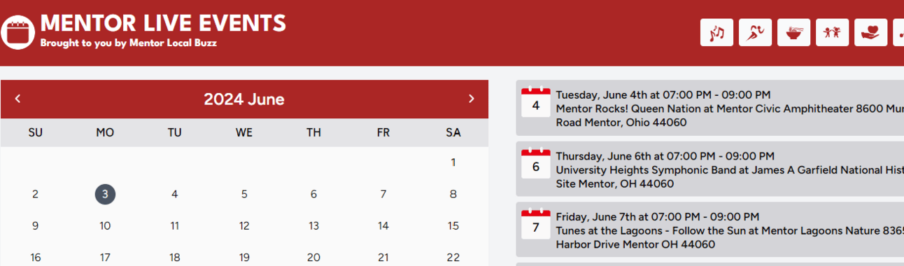 We're thrilled to introduce Mentor Live Events, brought to you by Mentor Local Buzz. This community-driven local calendar is designed for Mentor and our surrounding areas. With Mentor Live Events, you can easily find local happenings and keep up with what's going on around town.