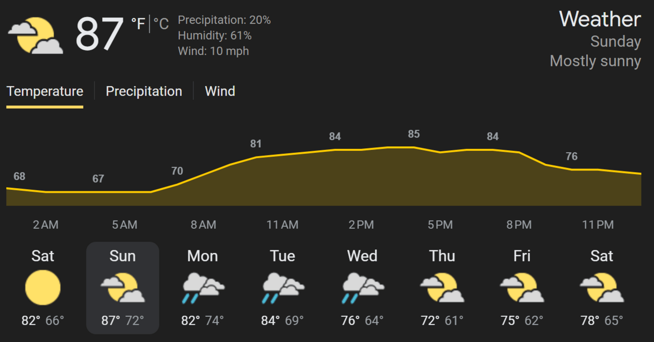 Humid, Partly Sunny, Chance of T-Storm in PM - Temps 87-90