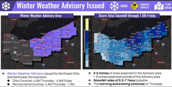A Winter Weather Advisory has been issued for several counties in Northeast Ohio, effective from 4 a.m. Thursday through 4 a.m. Friday. This system will bring widespread snow starting Thursday morning, making travel hazardous due to cold temperatures and accumulating snow. Snowfall totals are expected to range from 4 to 6 inches in the Mentor area, with the highest amounts likely under lake-enhanced snow squalls that develop later in the afternoon and evening. Slick road conditions are anticipated across primary and secondary snowbelt regions.