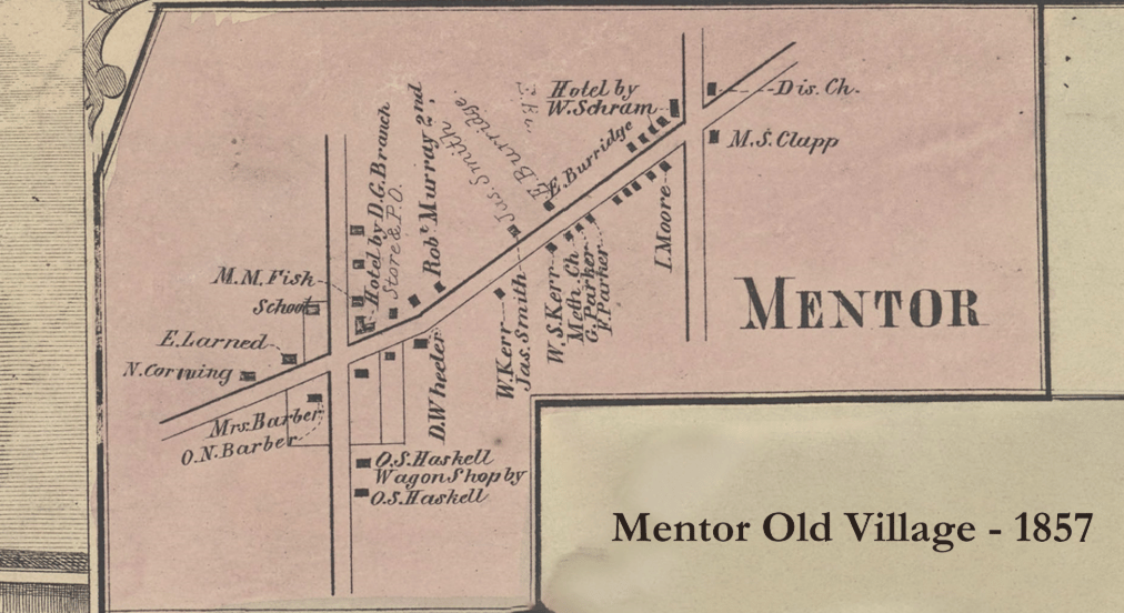 At the time, the cemetery at the northwest corner of Buffalo Road and Center Street had recently been cleared, with remains relocated to the new Mentor Cemetery on Hopkins Road to make way for a school. One historical home—the Corning House—still stands just west of the intersection, a rare survivor from that era.