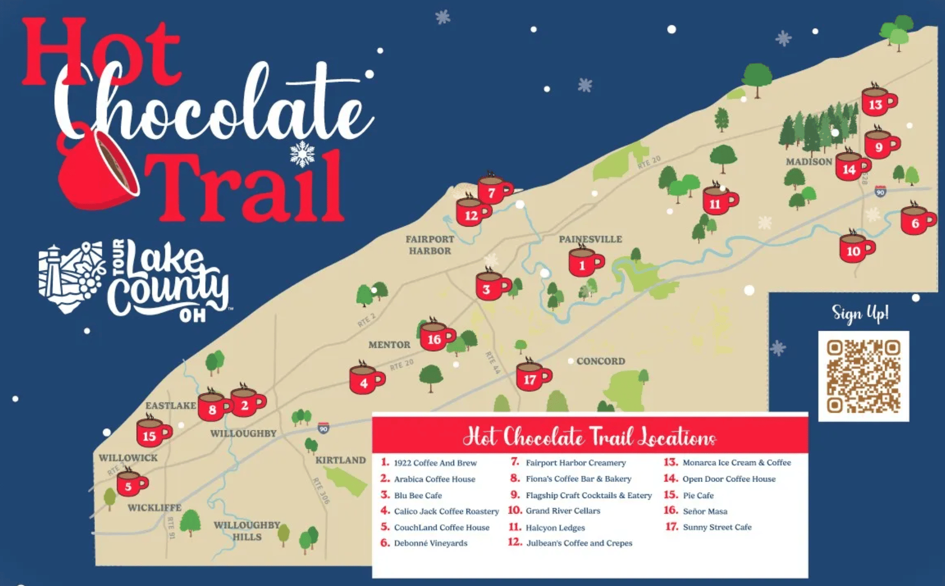 From rich Turkish hot chocolate at Blu Bee Café to a cold cocoa ice cream at Fairport Harbor Creamery, each location offers a cozy seasonal experience with unique flavors. New trail participants include recently opened spots like Monarca Ice Cream and Coffee, Halcyon Ledges, Blu Bee Café, and Señor Masa, opening soon in Mentor.