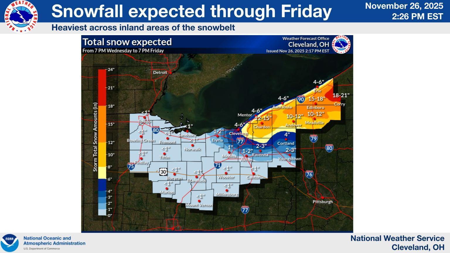 On Thanksgiving Day, shifting winds will push the snow into the Primary and Secondary Snow Belts. Expect heavy snow squalls, low visibility, and possibly thundersnow. Travelers should use caution Thursday and Thursday night, especially in higher-elevation areas.