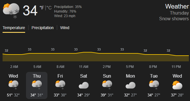 ❄️ Weather: High Winds, Scattered Snow Showers - Temps 32-34