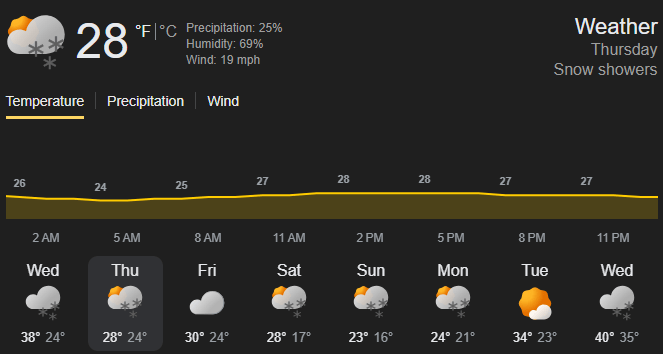 🌨️ Weather: Windy, Cold, Snow Showers - Temps 28-29