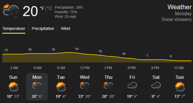 🌨️ Scattered snow & Windy. Temps dropping from 20° in the morning to single digits by sunset.