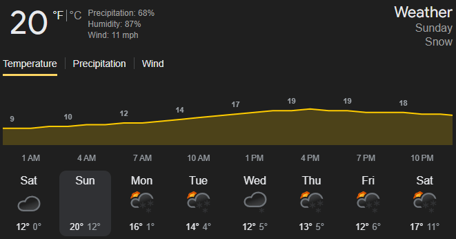 Temperatures will hover near 20 degrees Sunday afternoon, with a light breeze around 10 mph making conditions feel brisk but not extreme.