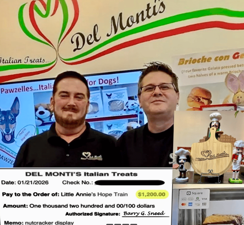 One local Christmas display turned holiday cheer into real help for families right here in our community. Thanks to the generosity of visitors and a little extra love from Del Monti’s Italian Treats, a meaningful donation was recently made to a wonderful local charity, Little Annie’s Hope Train.