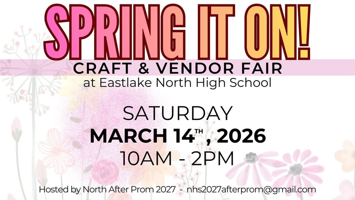 The Spring It On! Craft & Vendor Fair will take place on Saturday, March 14, 2026, from 10 a.m. to 2 p.m. at Eastlake North High School. The event is hosted by the North High School Class of 2027 After Prom Committee to help raise funds.