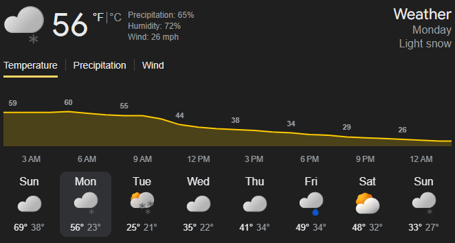 After the front passes around sunrise, temperatures will fall rapidly from the 50s to the low 30s by evening. Strong westerly winds (40–50 mph gusts) will continue through the day. Rain chances remain around 70%.